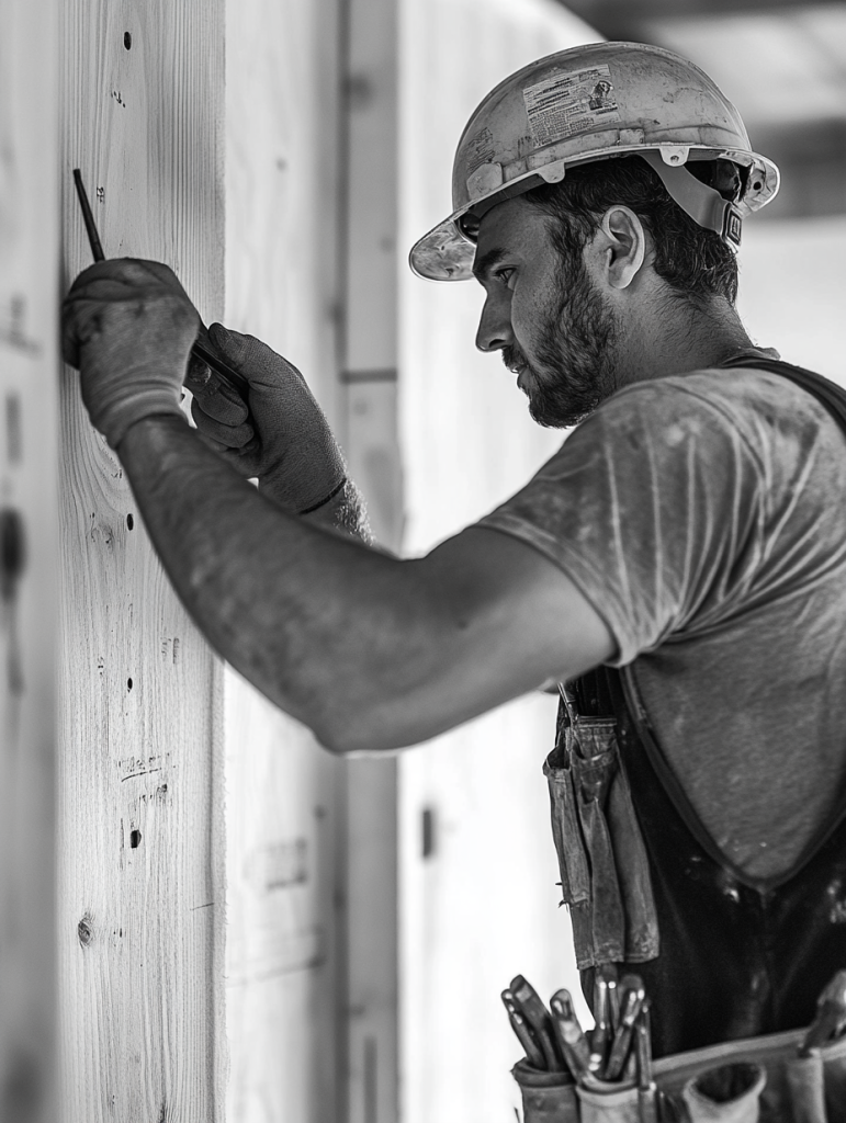 Når du skal bygge en vegg i bindingsverk, starter du med å kappe sviller og stendere til riktig lengde. Så fester du stenderne til bunnsvill og toppsvill med spiker. Mellom stenderne skal det være CC600, altså 600 mm fra midten av en stender til midten av neste stender. Det er også viktig å montere skråbånd for å gjøre veggen mest mulig stabil.