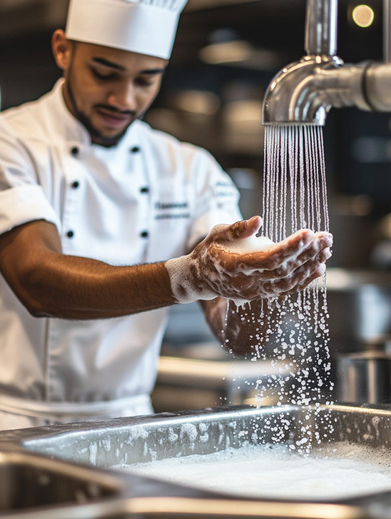 God håndhygiene er avgjørende. Som kokk må du vaske hendene godt med såpe i lunkent, rennende vann. Det må du gjøre før du begynner å lage mat, mellom arbeidsoppgaver og etter pauser og toalettbesøk. Hvis du har rifter eller sår på hendene, må du bruke hansker. Da må du huske å vaske hender før og etter hanskebruk. Hvis du glemmer det, kan hanskene bli forurenset av mikroorganismer fra hendene dine. Håndhygiene handler også om å ta av ringer og klokke. Neglene dine må være rene og velstelte.
